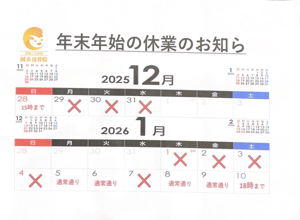 寒くなり、年末の忙しさも重なり、ぎっくり腰や肩こり、頭痛などお